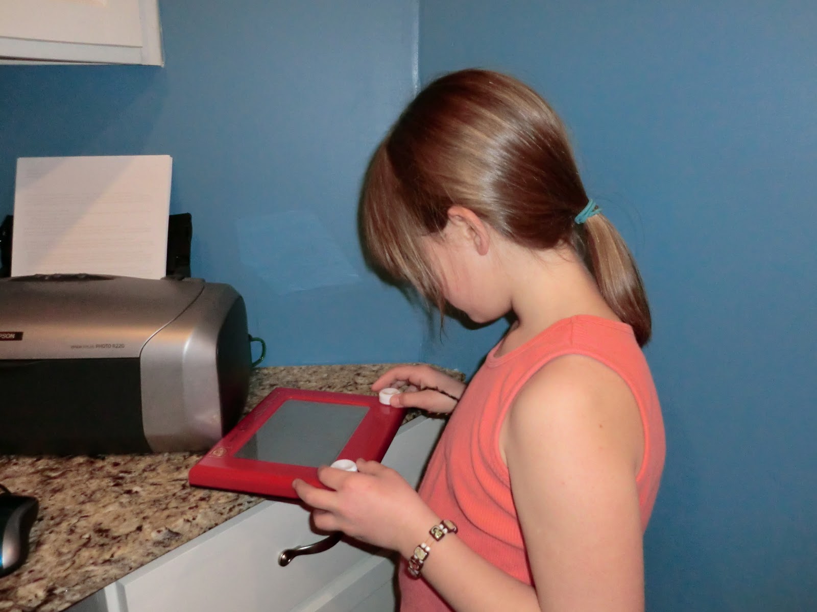 But I'd like to remember her like she is today. Today she is a girl who has given up fighting with her sisters for Lent. She is a girl who teaches her mom how to draw trees and creates elaborate etch-a-sketch creations. She is a girl who hates to take showers, but loads the dishwasher without complaint. She is a girl who loves stuffed animals - and loves me.